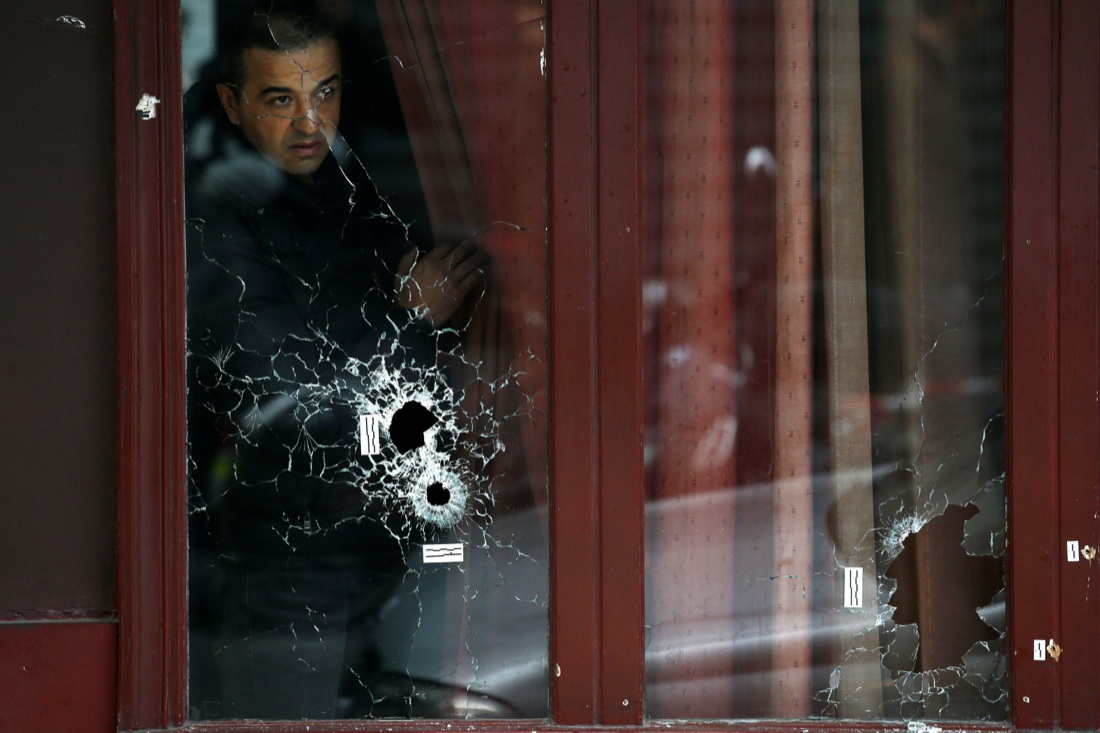 Un uomo guarda fuori dal Carillon cafe con la vetrina bucata dai proiettili dei terroristi dell’Isis – Parigi, 14 novembre 2015