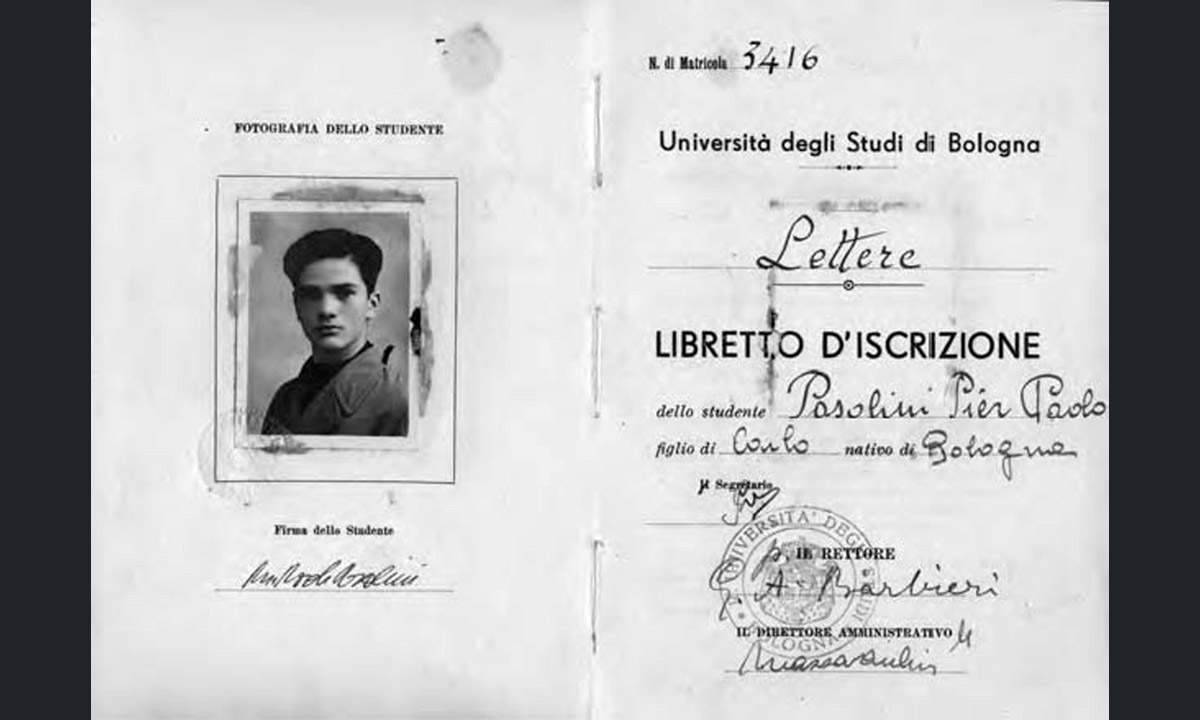 Pier Paolo Pasolini nella foto del suo libretto universitario.