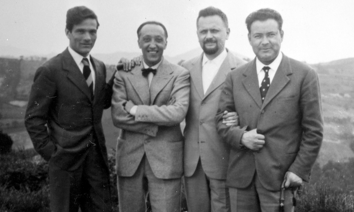 9 giugno 1957, colle di San Luca (Bologna). Pier Paolo Pasolini con, da sinistra, i poeti Francesco Leonetti, Roberto Roversi e Paolo Volponi.
