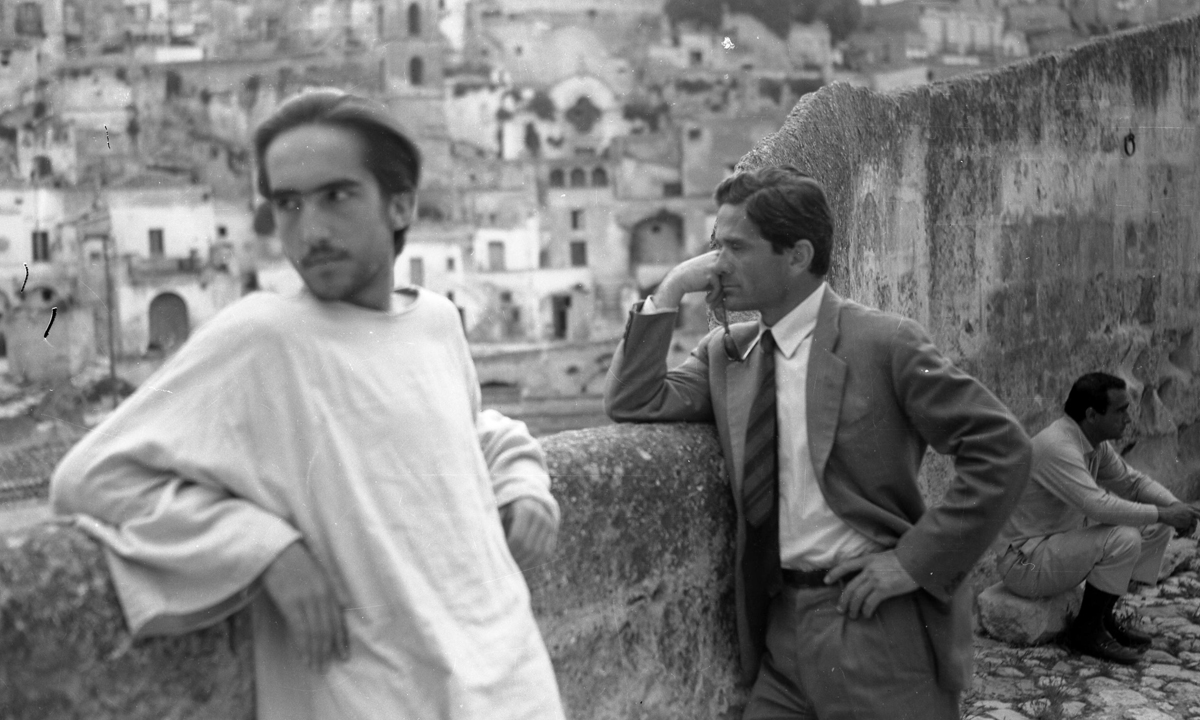 Enrique Irazoqui e Pier Paolo Pasolini in una foto di scena del film Il vangelo secondo Matteo (1964), , di fronte ai Sassi di Matera.