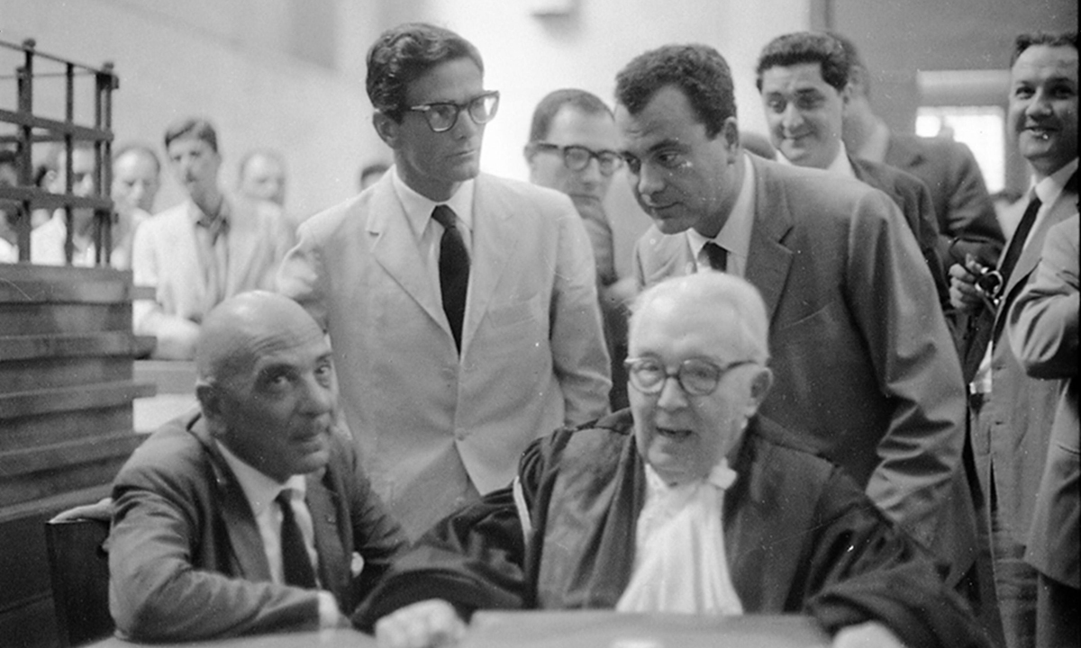 Latina 3 luglio 1962. Pier Paolo Pasolini tra gli avvocati nell’aula del tribunale per una udienza del processo che lo vide accusato (e infine prosciolto) di rapina a mano armata in un bar di proprietà di Bernardino De Santis.