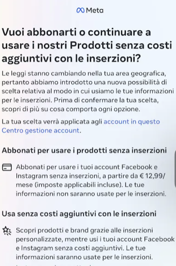 Se non l’hai ancora ricevuto, preparati perché sta per arrivare il messaggio di Facebook e Instagram per avvisare del lancio della versione a pagamento. Niente paura, però, perché seppur circoscritta agli utenti europei, la novità è una possibilità e non un obbligo. Come recita l’avviso recapitato dalle due piattaforme a chi apre l’app mobile: “Vuoi abbonarti o continuare a usare i nostri prodotti senza costi aggiuntivi con le inserzioni?”, si legge nel titolo. Cui seguono i dettagli: “Le leggi stanno cambiando nella tua area geografica, pertanto abbiamo introdotto una nuova possibilità di scelta relativa al modo in cui usiamo le tue informazioni per le inserzioni”. Poi c’è la spiegazione su cosa cambia scegliendo di pagare 12,99 euro al mese, oppure di non sborsare un euro per mantenere la situazione attuale. La differenza sta negli annunci pubblicitari, che saranno presenti sulla bacheca di chi opterà per la versione gratuita, mentre scompariranno dal news feed di chi verserà il canone mensile. In quest’ultimo caso, inoltre, Meta non consentirà alle aziende terze di utilizzare i dati degli abbonati.