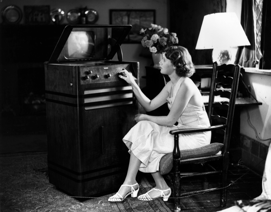 L’annunciatrice BBC Jasmine Blaigh sintonizza un apparecchio Baird nella primavera del 1936.