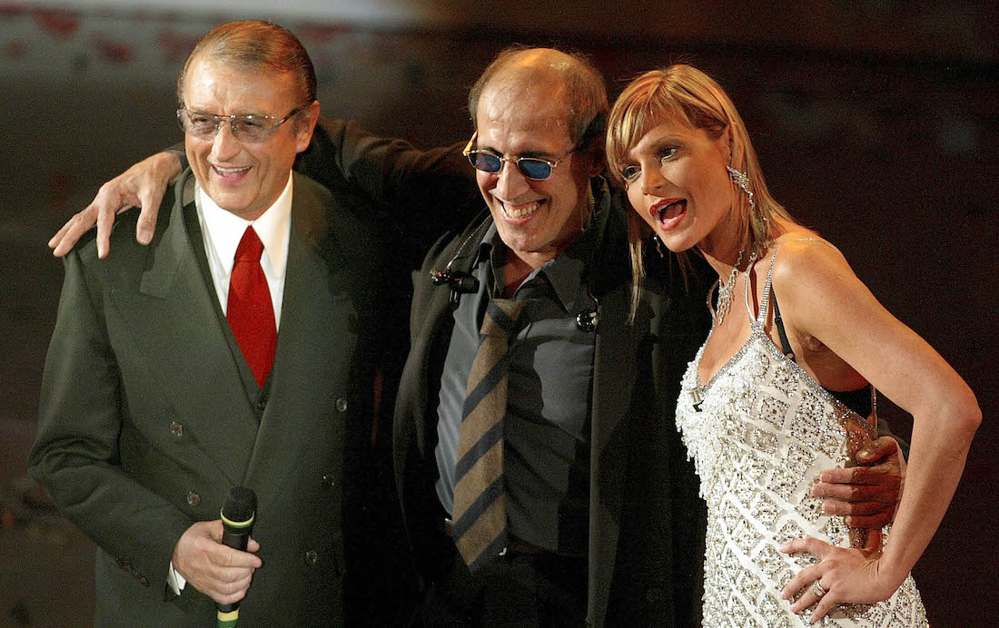 Tony Renis, Adriano Celentano e Simona Ventura sul palco del teatro Ariston
