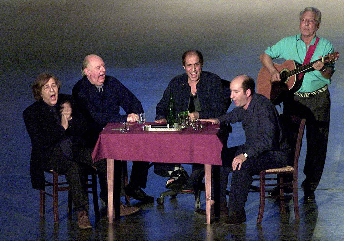 Giorgio Gaber, Dario Fo, Adriano Celentano e Antonio Albanese seduti al tavolo stasera durante la trasmissione ” 125 Milioni di caz…te ” . In piedi con la chitarra Enzo Jannacci. Milano, 17 maggio 2001.