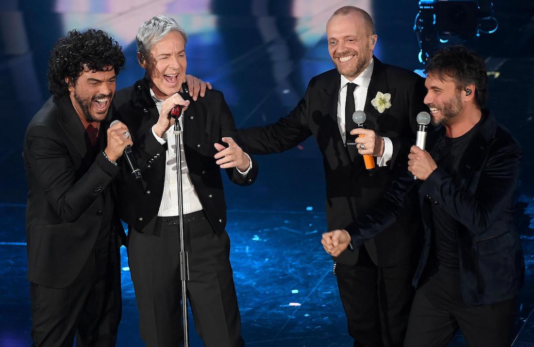 (L-R) Italian singers Francesco Renga, Claudio Baglioni, Max Pezzali and Nek perform on stage during the 68th Sanremo Italian Song Festival at the Ariston theatre in Sanremo, Italy, 10 February 2018. The 68th edition of the television song contest runs from 06 to 10 February.