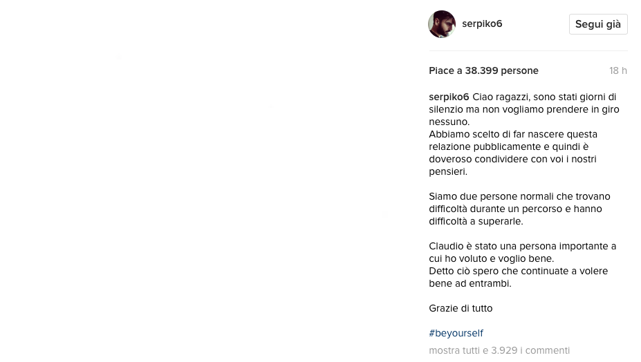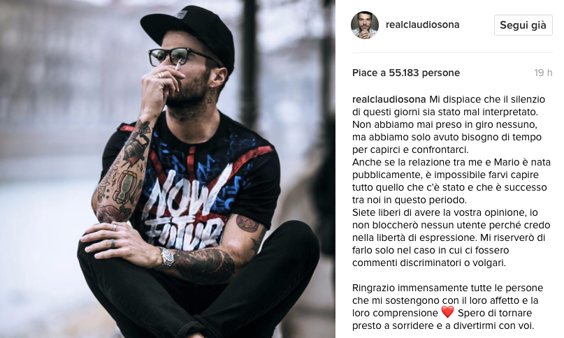 Molto pacato anche il commento di Mario Serpa: «Ciao ragazzi, sono stati giorni di silenzio ma non vogliamo prendere in giro nessuno. Abbiamo scelto di far nascere questa relazione pubblicamente e quindi è doveroso condividere con voi i nostri pensieri. Siamo due persone normali che trovano difficoltà durante un percorso e hanno difficoltà a superarle. Claudio è stato una persona importante a cui ho voluto e voglio bene.Detto ciò spero che continuate a volere bene ad entrambi».