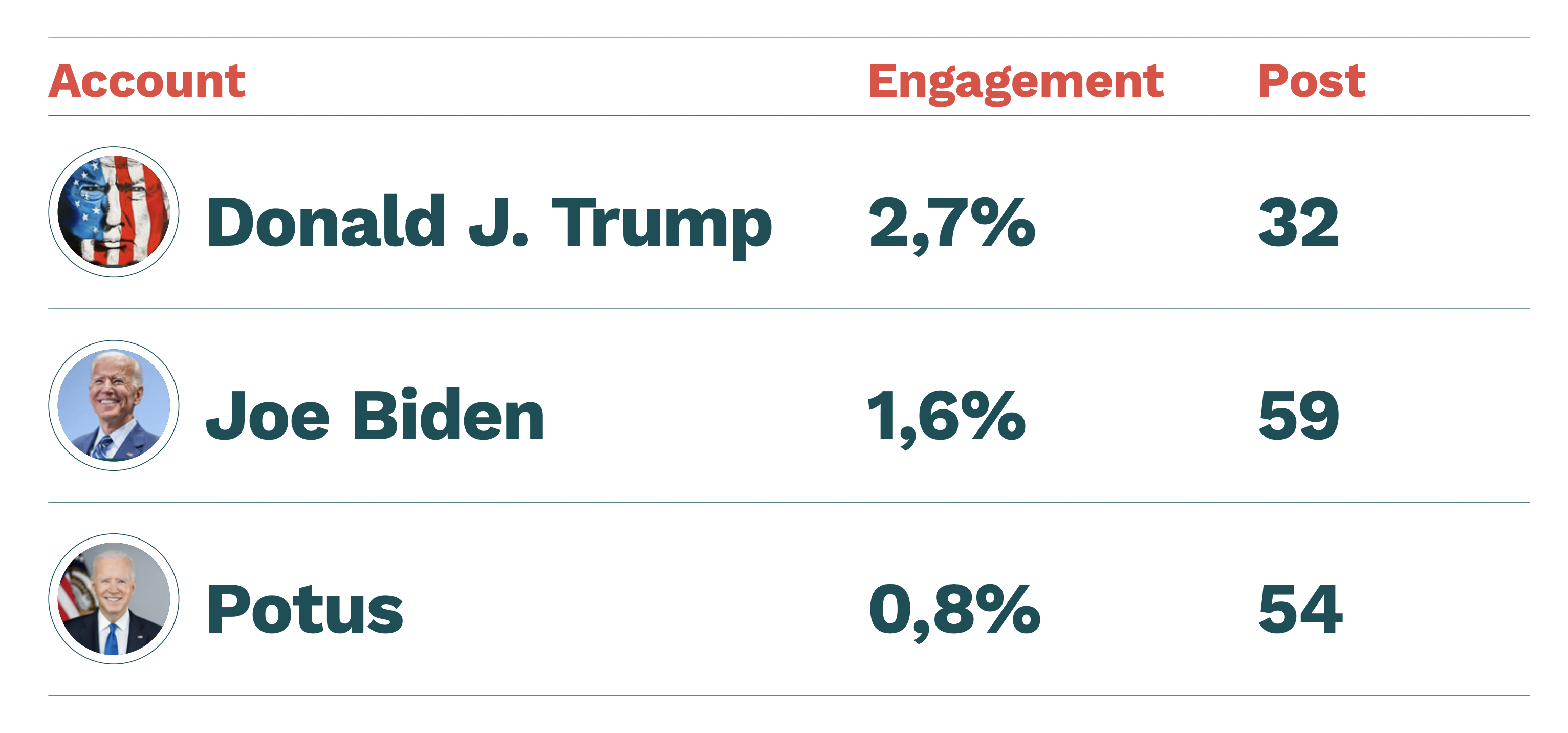 L’account di Biden invece incassa appena 4.5 milioni di reaction ,quindi meno della metà, ma soprattutto perde 9.100 follower.