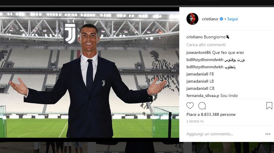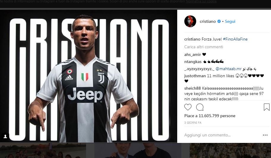L’arrivo a Torino, però, ha aggiunto l’intero tifo bianconero ai follower del calciatore che così, con la prima immagine con la maglia della Juve – la numero 7 naturalmente – ha già conquistato 11,4 milioni di “Mi piace”. Cristiano dei record è già pronto alla prossima stagione di successi.
