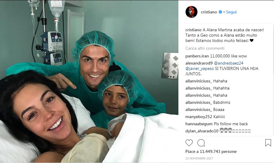 Ma se le foto juventine di CR7 stanno scalando rapidamente la classifica dei post più visti di sempre lo stesso Cristiano ha più volte superato se stesso consegnando alla storia di Instagram tutta una serie di foto da record. C’è ad esempio quella della nascita di Martina Alana datata 12 novembre 2017 con 11,4 milioni di like, o quella in cui solleva la sua quinta Champions vinta con il Real Madrid: 9,4 milioni di like; per non parlare della recentissima immagine delle vacanze in barca con Georgina e Cristiano Jr. (11 milioni)