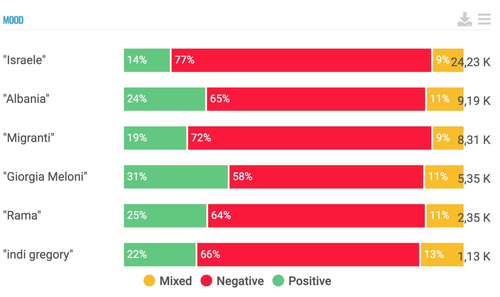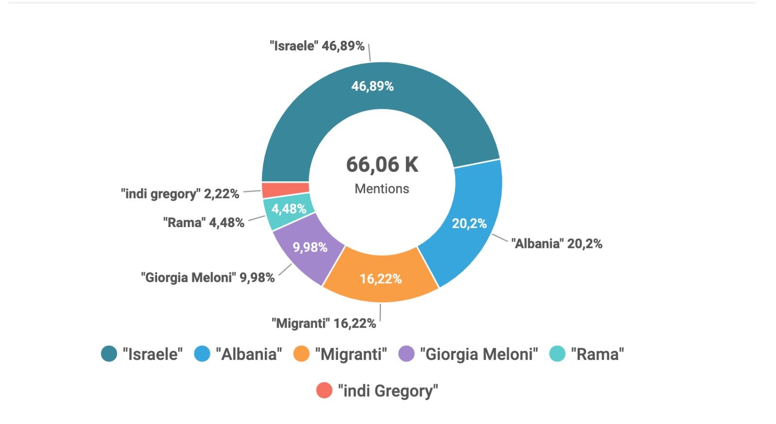 Israele ??, con le 31 mila menzioni digitali è la parola chiave più utilizzata, poi a scendere troviamo Albania, Migranti e Meloni tra le più citate per un parlato complessivo che raggiunge la soglia delle 66 mila menzioni.