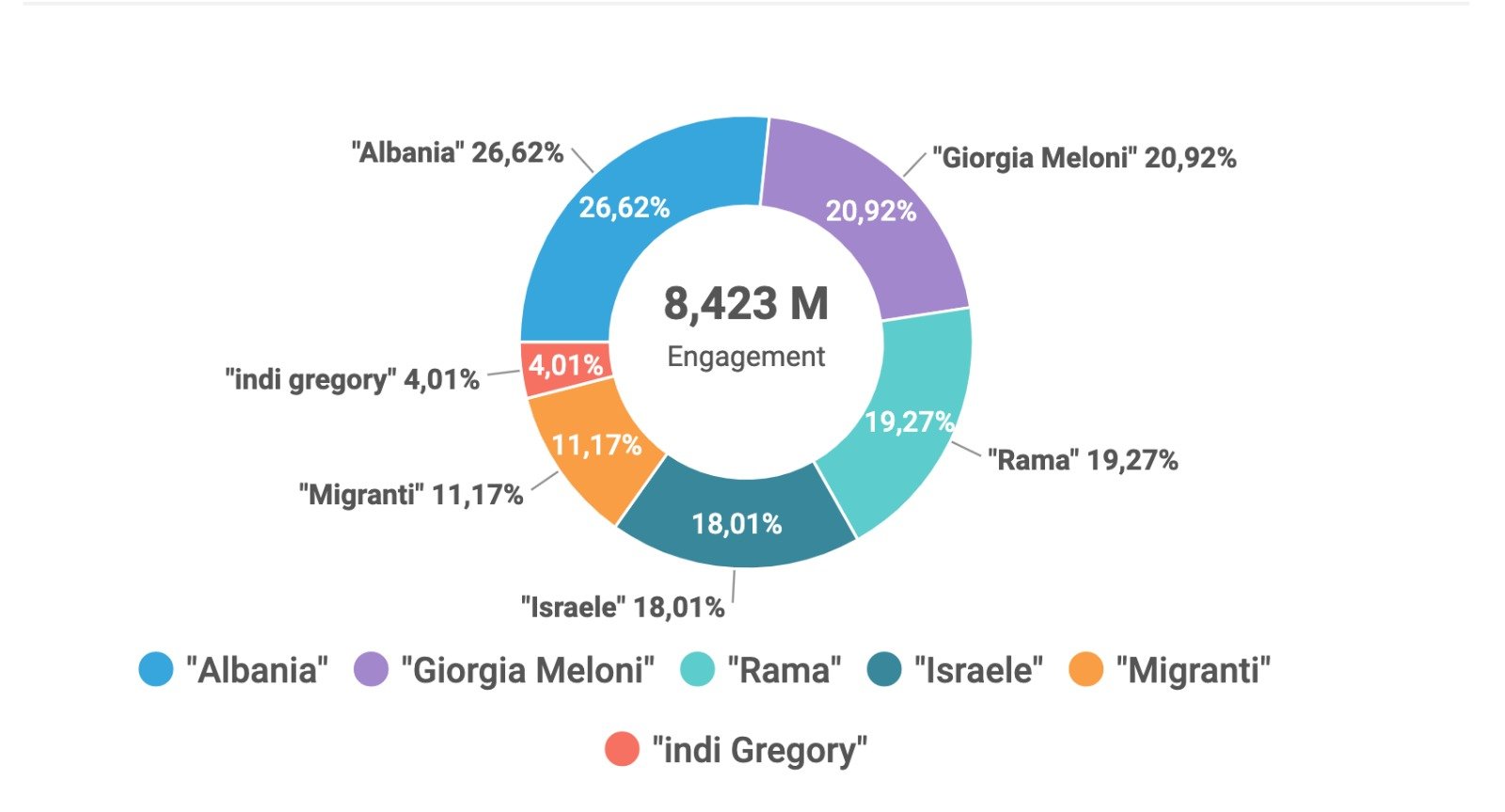 A dispetto dei volumi di menzioni, pero le due parole chiavi che in questa settimana hanno generato più coinvolgimento e polarizzazione sono Albania, Giorgia Meloni e Rama che in totale hanno catturato il 66,81% degli 8,5 milioni di interazioni generato dal parlato.