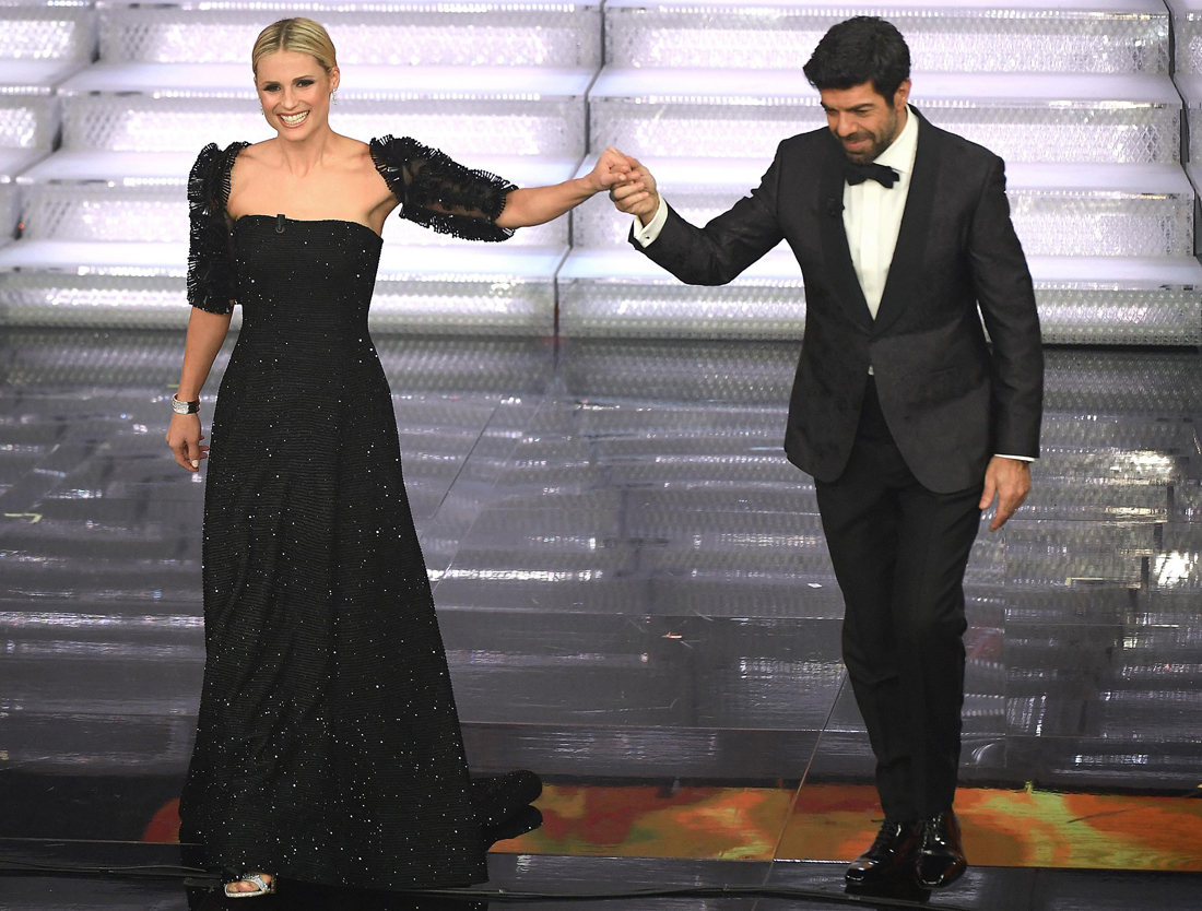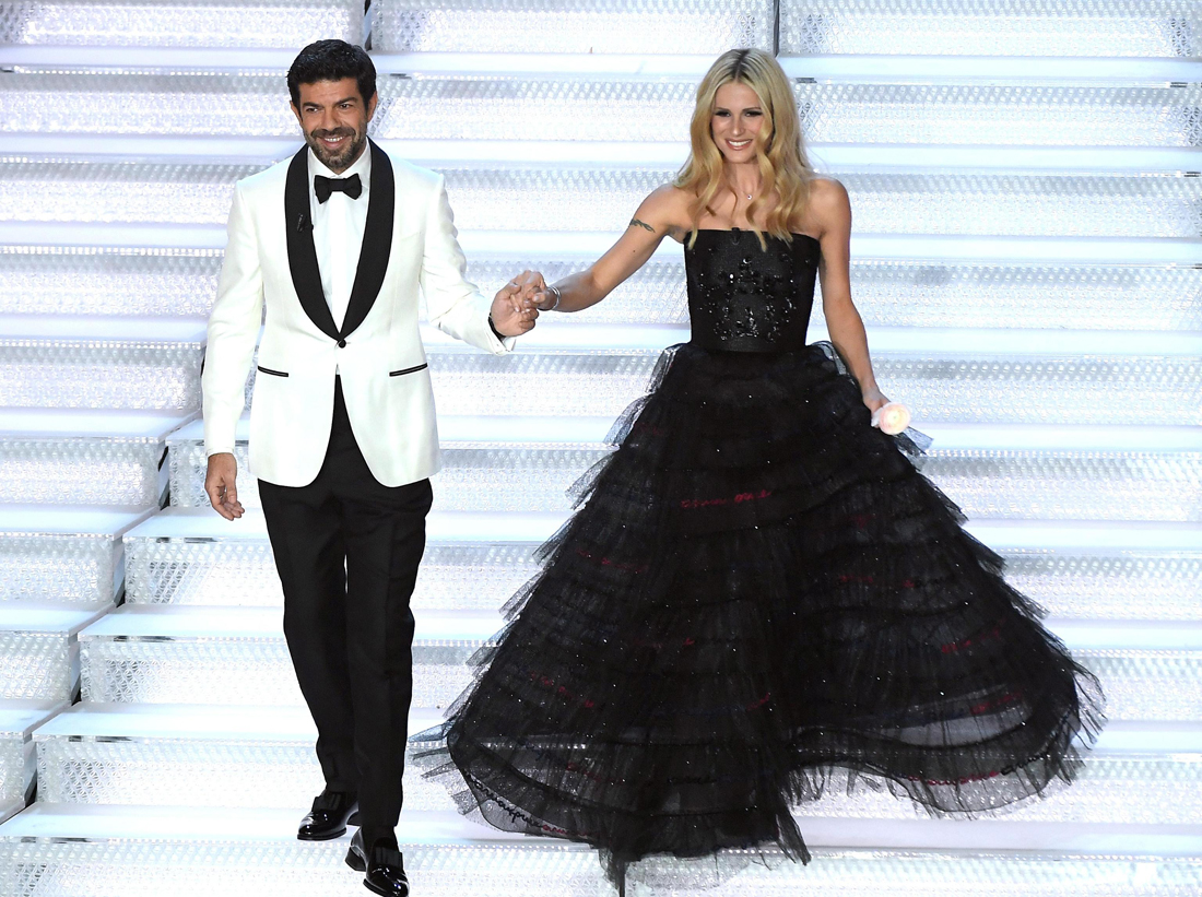 Swiss-Italian TV showgirl Michelle Hunziker (R) and Italian actor Pierfrancesco Favino (L) on stage during the 68th Sanremo Italian Song Festival at the Ariston theatre in Sanremo, Italy, 10 February 2018. The 68th edition of the television song contest runs from 06 to 10 February.