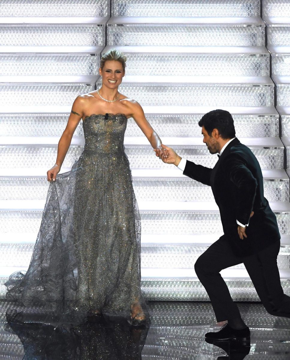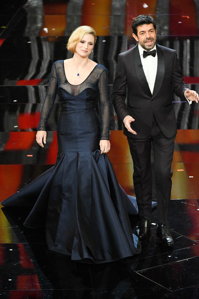 Michelle Hunziker e Pierfrancesco Favino sul palco dell’Ariston. San Remo, 8 febbraio 2018