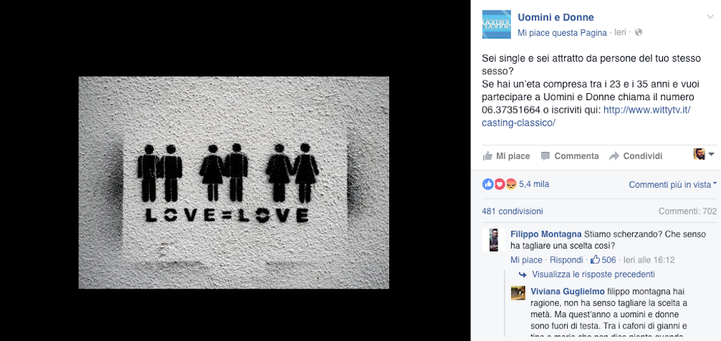 Appena il tempo di chiudere la stagione 2015/2016, che già la redazione di Uomini e Donne è al lavoro su quella che inizierà il prossimo settembre. Con una curiosità ancora maggiore poiché la nuova edizione si arricchirà del “trono gay”, annunciato lo scorso marzo dalla stessa Maria De Filippi in un’intervista a Chi. “Spariglio le carte. Ho in mente da tempo di voler fare il trono gay. Non cerco lo scandalo, ma la normalità di un amore vissuto nella sua piena quotidianità”, spiegò la conduttrice. Proprio ieri sulla pagina Instagram della trasmissione, che ha sfondato quota 1 milioni e 100 mila seguaci, è apparso l’annuncio dell’avvio delle selezioni: i casting sono aperti per ora agli uomini tra i 23 e i 35 anni. E già fioccano le autocandidature più improbabili da parte di pseudo-famosi che aspirano allo show defilippiano più attratti dalla visibilità che dalla possibilità di trovare il vero amore.