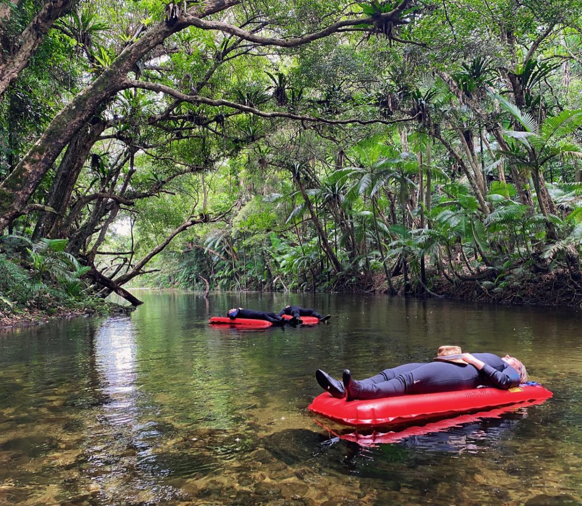 Dal resort si parte per diverse escursioni. Un classico è la gita sul fiume Daintree, magari sulle barche a energia solare della Solar Whisper Wildlife Cruise, per ammirare i coccodrilli in libertà. Con un po’ di fortuna, sui rami potrete vedere cuccioli non più lunghi di 20 centimetri quasi perfettamente mimetizzati. Oppure si può fare snorkeling sul Mossman river (con la Back country bliss adventures). A questo proposito, nienti timori: i coccodrilli vivono solo in acque calde e lente o nelle foci. Indossati tuta e calzari, ci si lancia in una delle piscine naturali che si formano vicino alla riva: fra tanti pesci, con un po’ di fortuna ci si può imbattere in una tartaruga d’acqua dolce. In questo caso, non saltate su iniziando a urlare per avvertire i compagni di viaggio se non volete vederla svanire in un batter d’occhio. Fra una nuotata e l’altra, arriva il momento di tornare alla base sdraiati sui gommoni su cui affrontare le rapide, sovrastati dalla cupola vegetale formata dagli alberi. L’esperienza da non perdere, che da sola vale il viaggio, è l’escursione fra le mangrovie: a piedi nudi, guidati da un aborigeno, si attraversa una sorta di palude sabbiosa bruciata dal sole che si estende a perdita d’occhio.