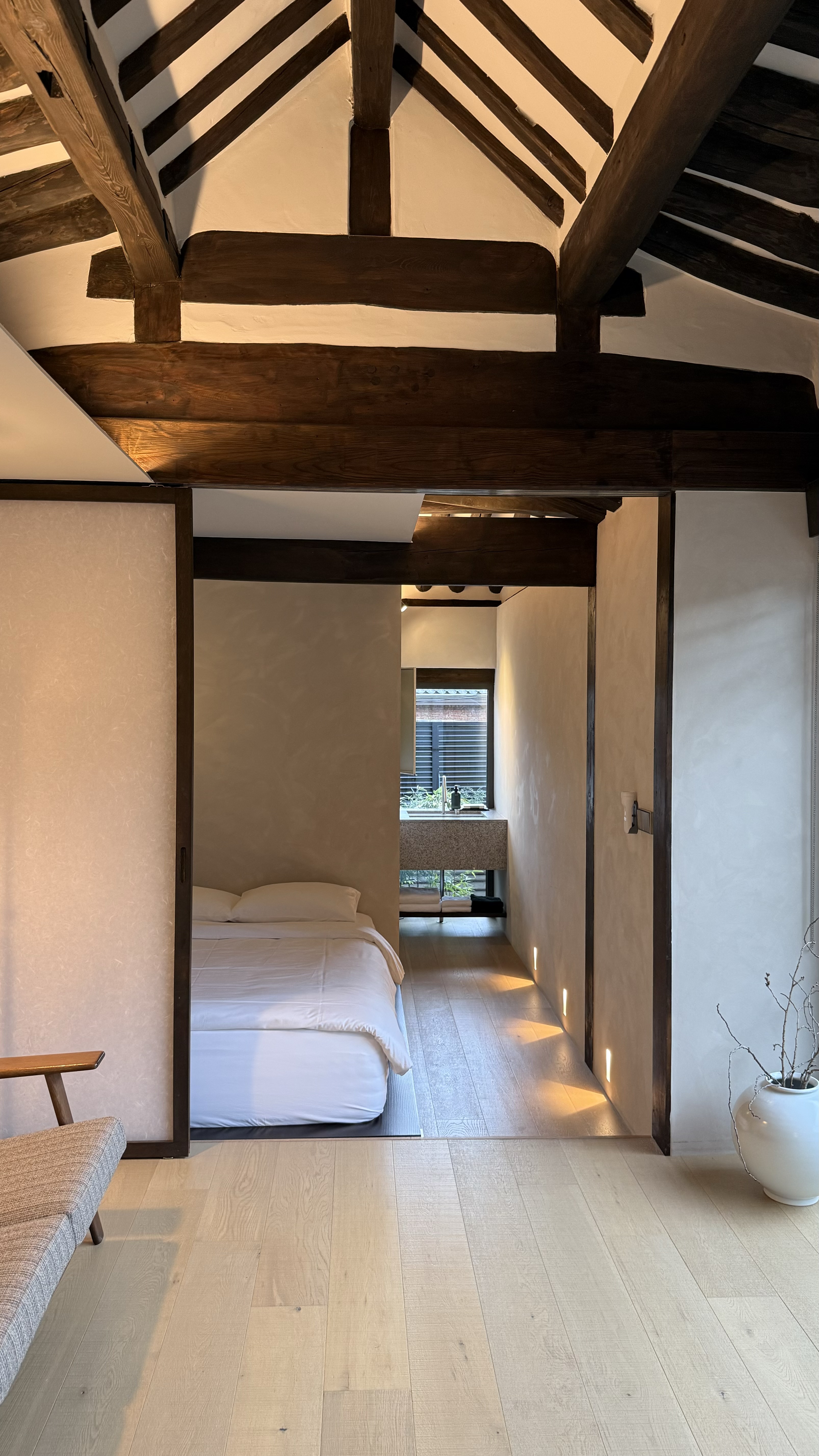 All’interno, ogni elemento invita alla contemplazione. La luce naturale filtra delicatamente attraverso le finestre coperte da hanji, le tradizionali tende di carta coreana, proiettando morbidi riflessi sulle superfici in legno e creando un’atmosfera che oscilla tra intimità e magia. Camminando lungo il corridoio, l’occhio si perde nei dettagli: le travi di legno che raccontano una storia di secoli, i colori caldi del giardino visibile dalle vetrate e l’armonia dei materiali che intrecciano passato e presente.