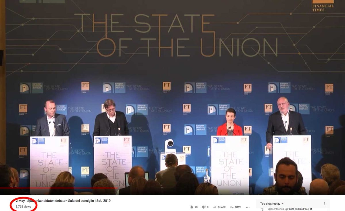Quello che vedete è un’immagine di un link Youtube creato ieri per trasmettere in diretta da Firenze il dibattito tra i 4 candidati alla prossima presidenza della Commissione Europea (il prossimo Juncker, per intenderci), dopo le Elezioni del 26 maggio: Manfred Weber (Ppe), Frans Timmermans (Pse), Guy Verhofstadt (Alde) e Ska Keller (Verdi). Se volete sapere chi sono e la loro posizione sull’Europa, leggete l’approfondimento. Ma qui vogliamo sottolineare un’altra cosa.