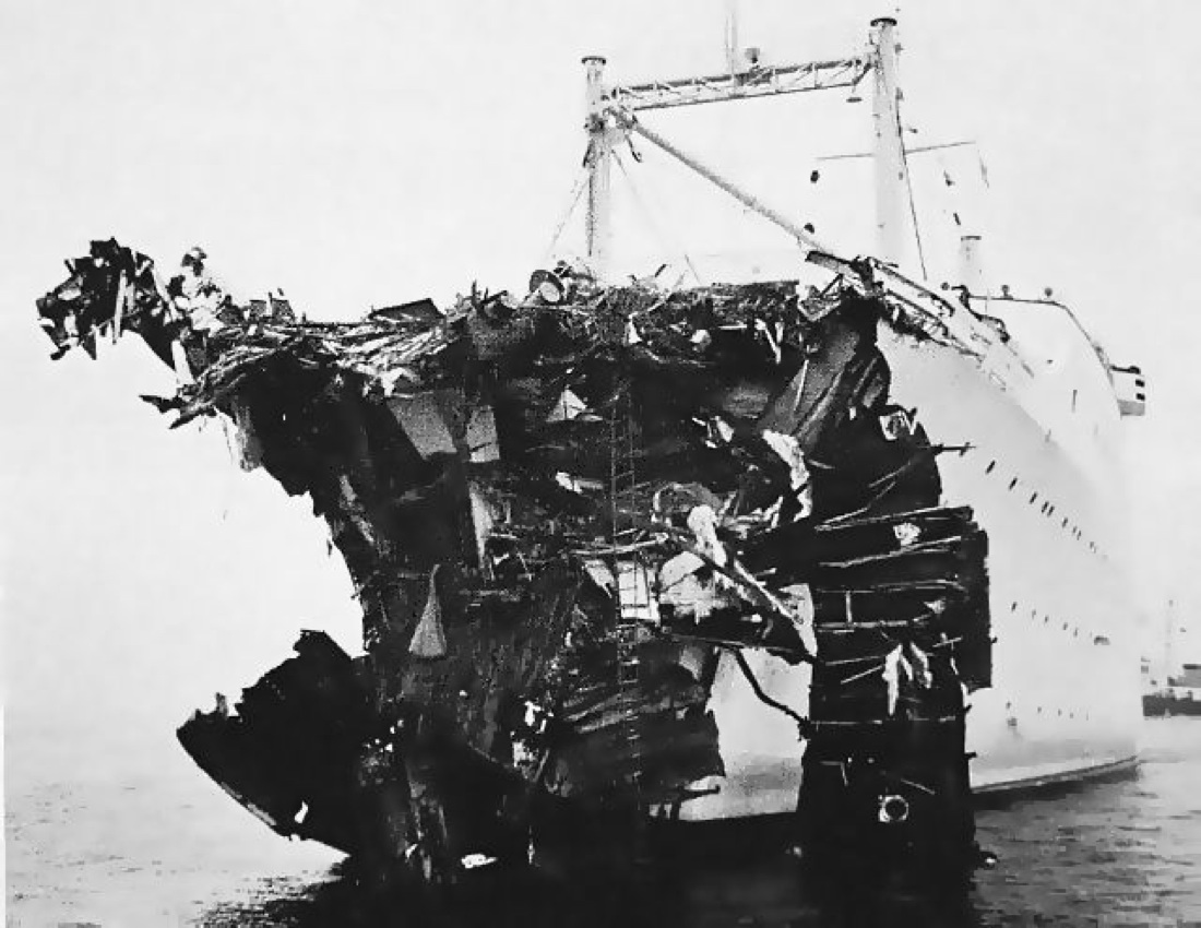 La prua sfondata dell’ MS “Stockholm” dopo il rientro a New York in seguito alla collisione.