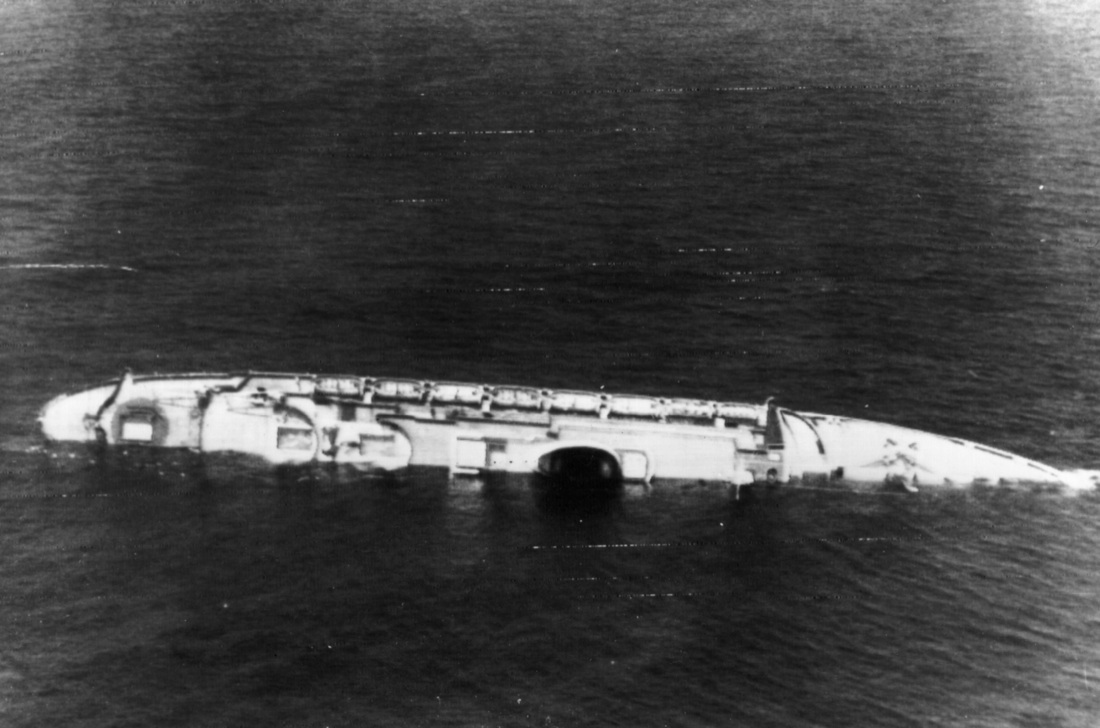 Nella foto aerea, la mattina del 26 luglio 1956 l’Andrea Doria era ormai fortemente inclinato a dritta (dx)