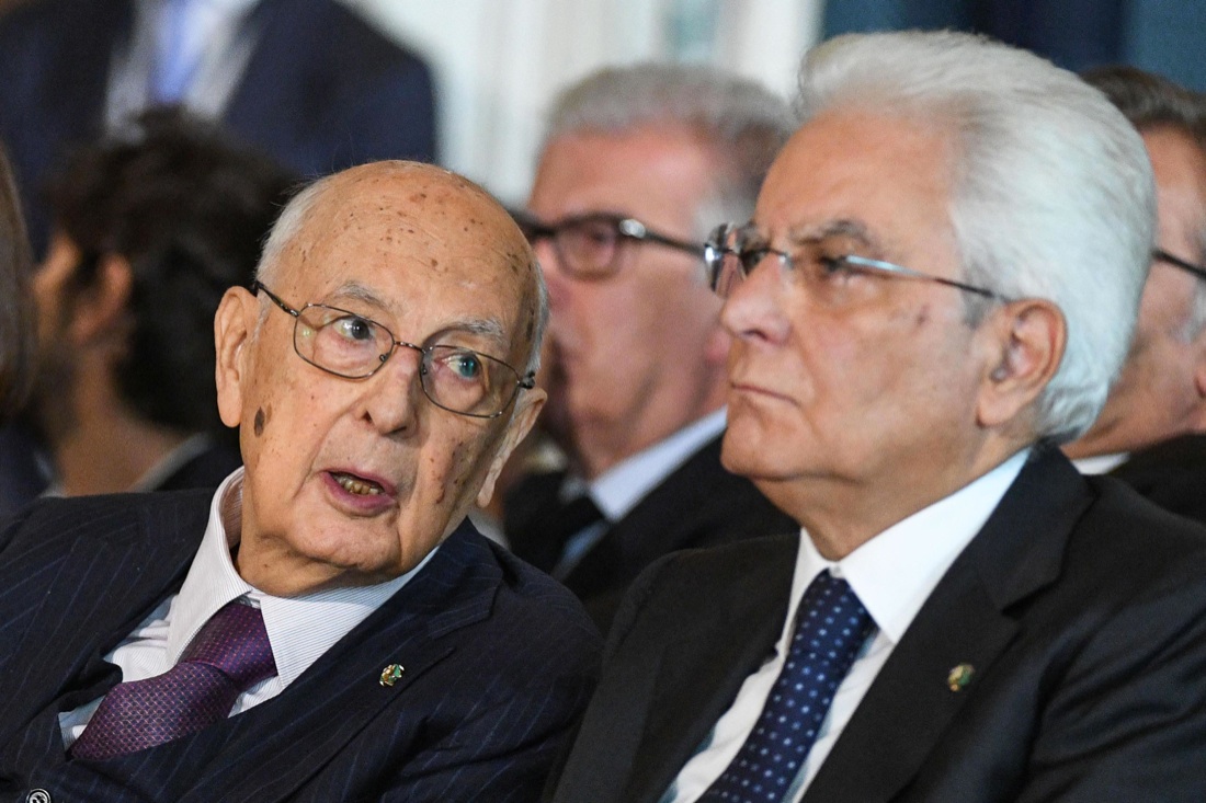 Il senatore Giorgio Napolitano e il presidente della Repubblica Sergio Mattarella, in occasione della cerimonia per i 100 anni dalla nascita di Aldo Moro al Quirinale, Roma, 23 settembre 2016
