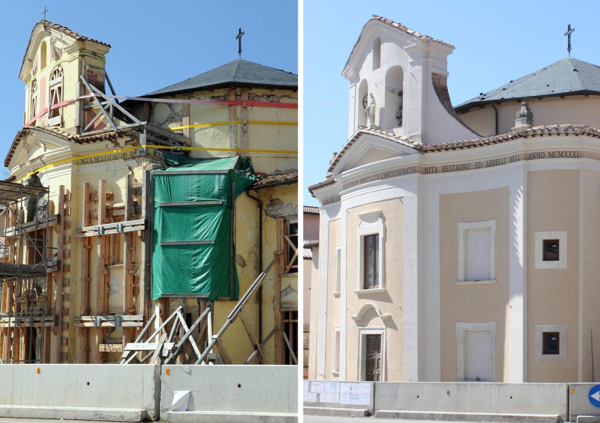 Nella combo la Chiesa di Paganica dopo il terremoto del 2009 e oggi dopo al ricostruzione. Claudio Lattanzio