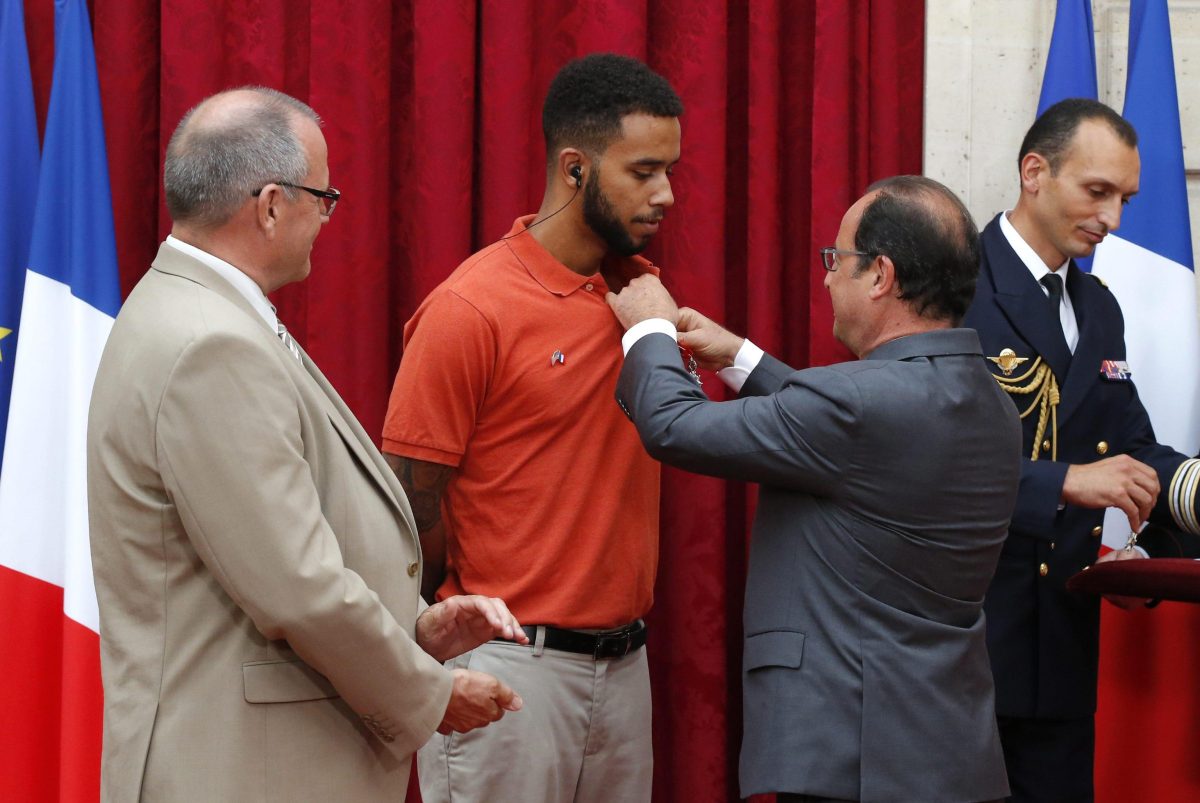 Il presidente francese Francois Hollande ha insignito della legione d’onore i quattro passeggeri del treno Amsterdam-Parigi intervenuti per fermare l’assalitore Ayoub El Khazzani.
