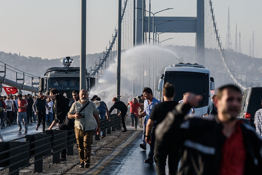 Cannoni d’acqua per disperdere la folla sul ponte sul Bosforo a Istanbul – 16 luglio 2016