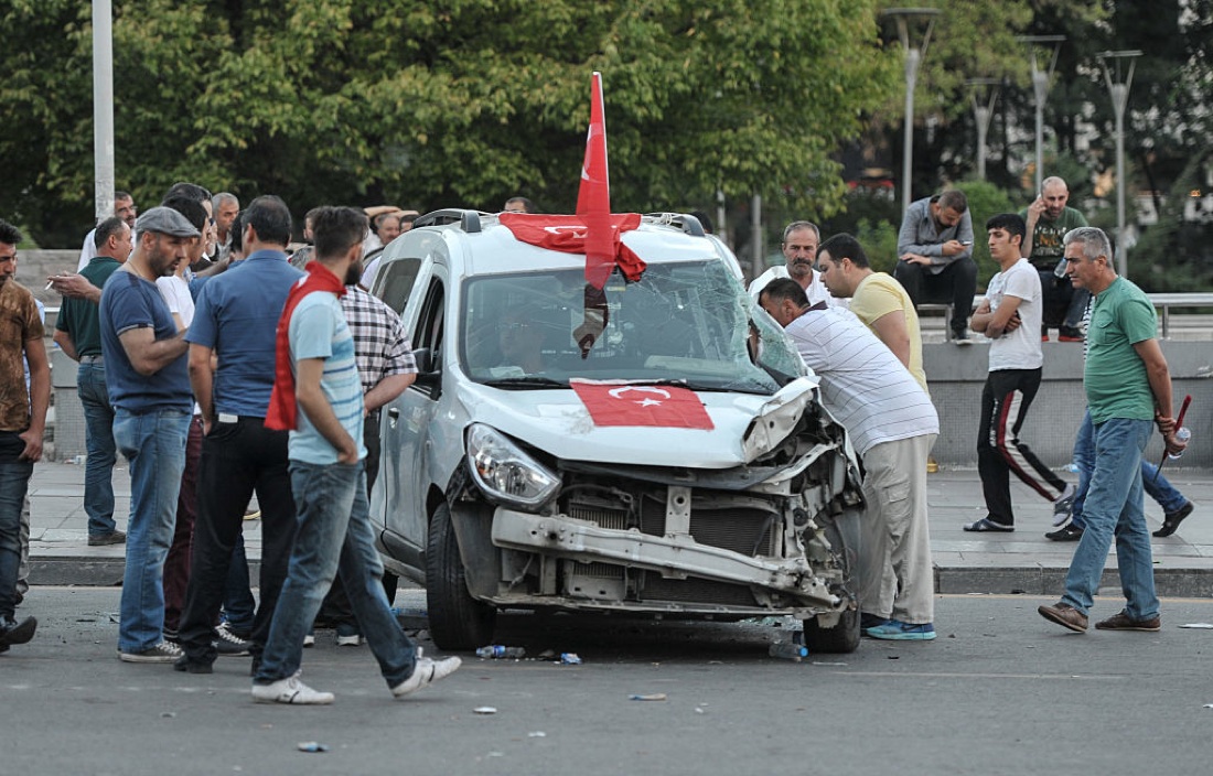 Persone intorno a un’auto distrutta ad Ankara – 16 luglio 2016