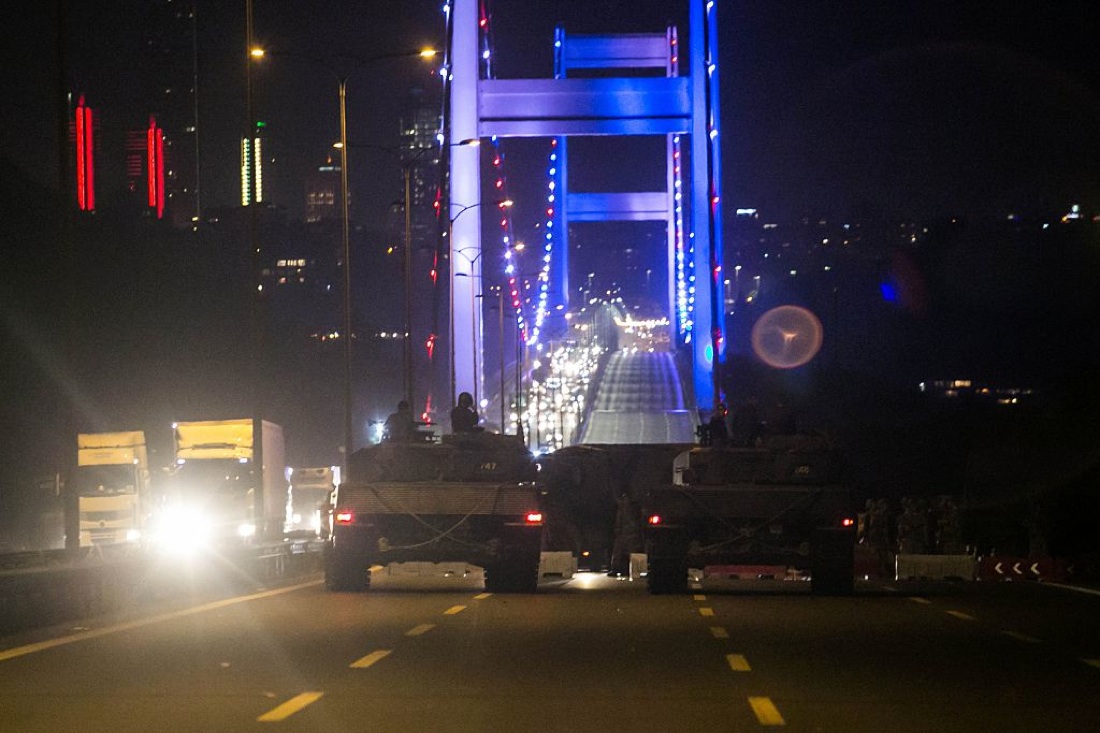 15 luglio 2016. Militari entrano sul ponte Fatih Sultan Mehmet durante il tentativo di colpo di Stato.