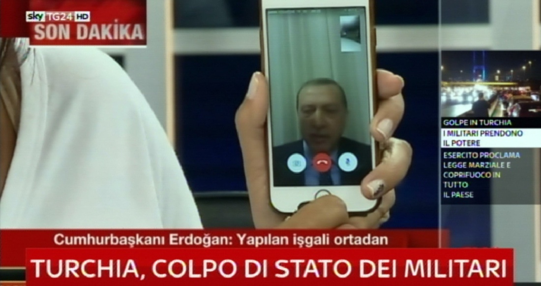 Il presidente della Turchia Recep Tayyip Erdogan ha parlato in diretta ad uno smartphone di una giornalista della Cnn Turk, 15 luglio 2016