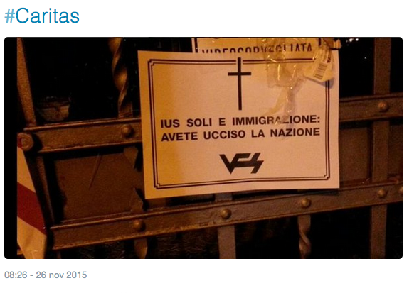 “Masse di stranieri ci stanno invadendo”: lo scrive il Veneto fronte skinheads sul proprio sito rivendicando blitz nella notte del 24 novembre a diverse sedi della Caritas e del Pd nel Nord Italia. Azioni – con manifesti funebri e sagome di cadaveri con i colori della bandiera italiana – fatte per “denunciare chi continua a condurre un chiaro disegno politico finalizzato all’annientamento dell’identità italiana” con leggi di “distruzione di massa” come quella sullo ius soli e il “favoreggiamento di un’invasione pianificata di orde di immigrati extraeuropei”.