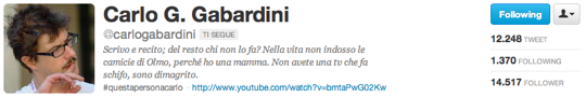 Direi proprio di no (ForsePeròPerchéInEffettiNonLoSono; mi spiace ma non ce l’ho fatta a trattenermi). Comunque non penso sia di una qualche utilità per procacciarsi lavoro come attore; forse potrà esserlo in futuro per il mio lavoro d’autore, ma più nell’accezione: ‘Ah, ma allora Carlo Gabardini è vivo e sa ancora l’italiano! Cià che lo chiamo, ché ho da scrivere una cosetta senza budget, ma tanto ormai questo è finito su twitter dove scrive gratis per tutti, sarà alla frutta!’ Aggiungo che, con mia grande gioia e soprattutto soddisfazione, per fortuna moltissimi su twitter non sanno che io faccia l’attore o interpreti Olmo in cameracafè; direi che l’affaire #questapersonacarlo al Tg1 ne sia una precisa e divertente testimonianza. https://www.youtube.com/watch?v=bmtaPwG02Kw
