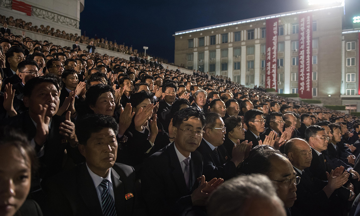 10 maggio 2016. Il pubblico assiste dagli spalti alla parata con fiaccole che in piazza Kim Il-Sung a Pyongyang, in Corea del Nord, ha celebrato la fine del 7° congresso del Partito dei lavoratori.