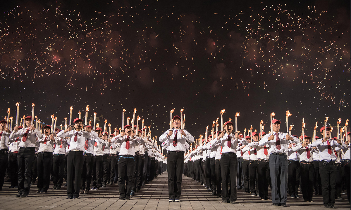 10 maggio 2016. Un momento della coreografia di massa eseguita in piazza Kim Il-Sung a Pyongyang, in Corea del Nord, al termine della parata che ha celebrato la fine del 7° congresso del Partito dei lavoratori.