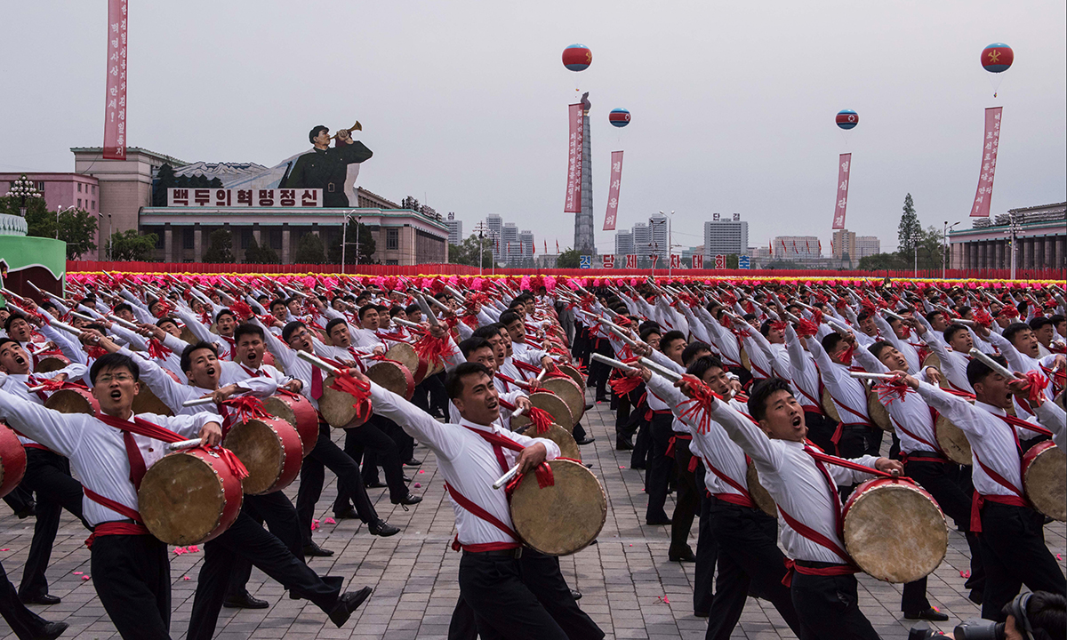 10 maggio 2016. Suonatori di tamburi partecipano alla parata di massa che in piazza Kim Il-Sung a Pyongyang, in Corea del Nord, ha celebrato la fine del 7° congresso del Partito dei lavoratori.