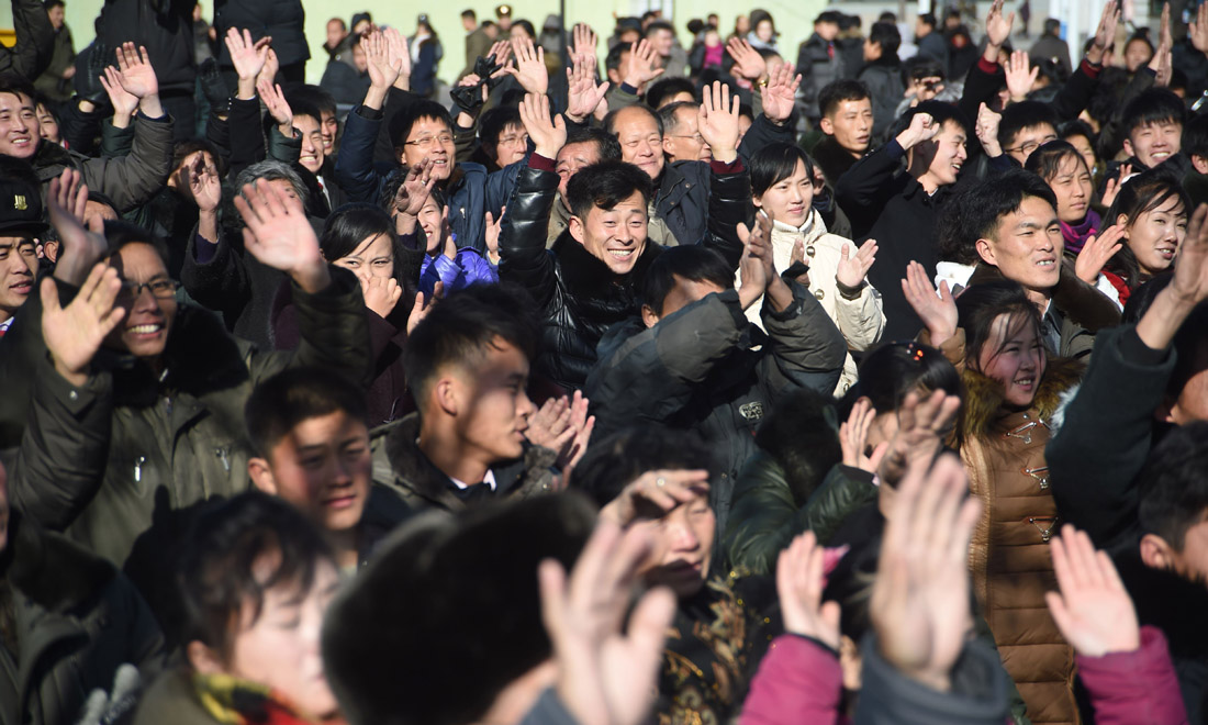 La reazione di alcuni abitanti di Pyongyang, assemblati vicino a un grande schermo nei pressi della stazione, dopo la notizia del successo del lancio del nuovo missile balistico intercontinentale (ICBM) Hwasong-15, 29 novembre 2017.