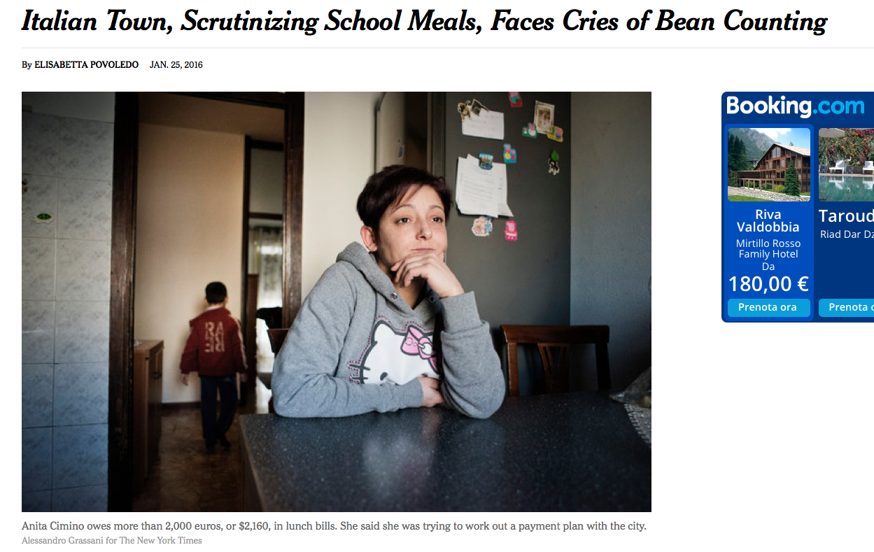 ll sito del New York Times dedica stamane alla controversa decisione del sindaco del comune di Corsico (Mi) di tagliare la mensa scolastica ai bambini delle famiglie morose un lungo reportage a firma di Elisabetta Povoledo.