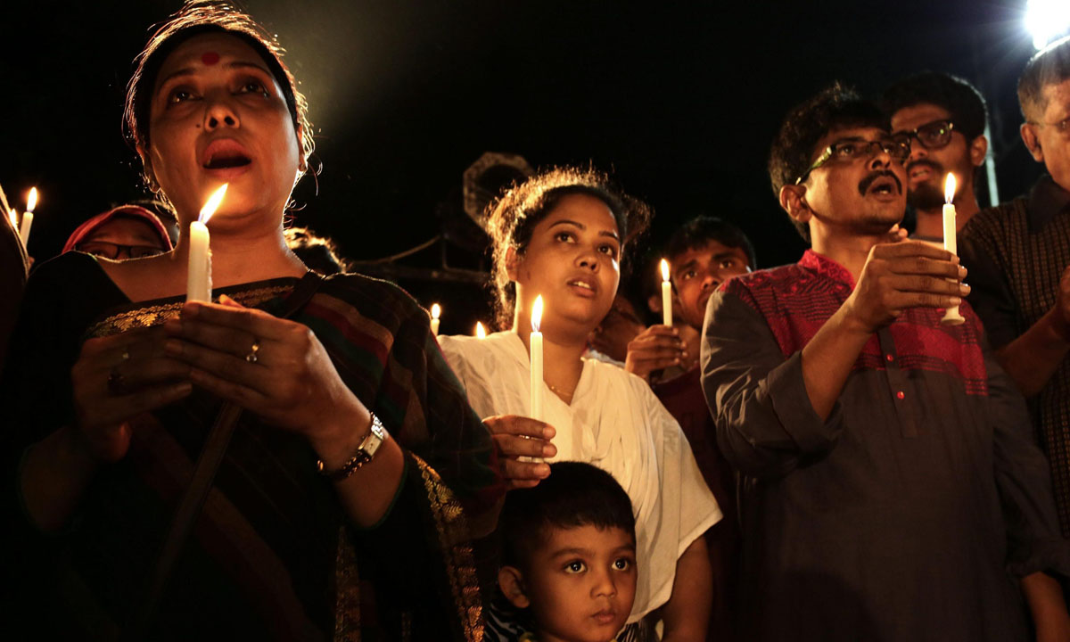 3 luglio 2016. A Dacca, in Bangladesh, attivisti culturali, insegnanti e persone comuni partecipano a una veglia in memoria delle 22 persone, di cui 9 italiani, 7 giapponesi un indiano e 5 bengalesi – uccise nell’attacco terroristico condotto da un commando jihadista del gruppo Jamautul Mujahedin presso il popolare ristorante Holey Artisan Bakery.