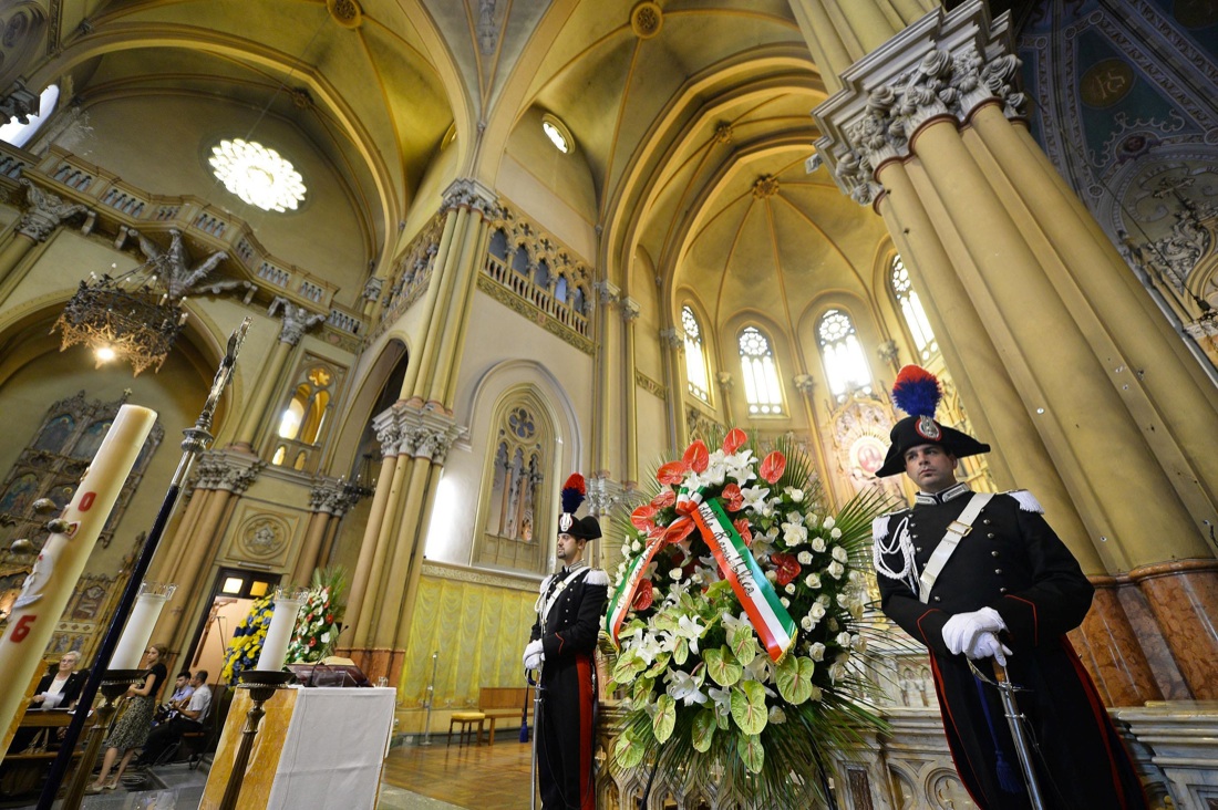 Le corone di fiori del Presidente della Repubblica e del Consiglio durante il funerale di Claudia Maria D’Antona morta nell’attacco terroristico a Dacca in Bangladesh presso la Chiesa Gesù Nazareno, Torino, 8 luglio 2016