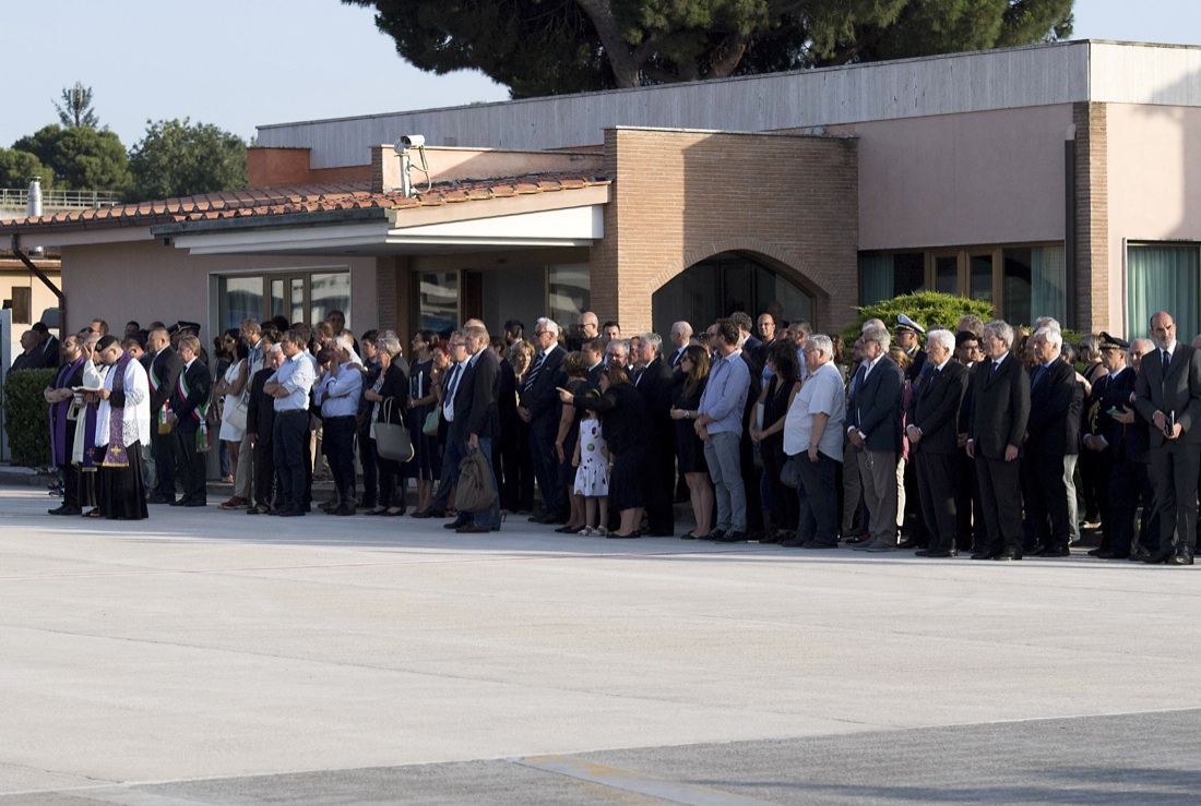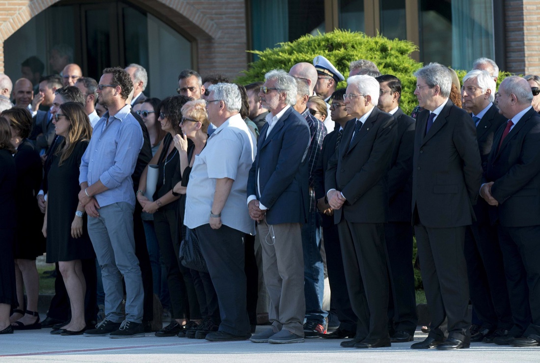 Il Presidente della Repubblica Sergio Mattarella, con a fianco il Ministro degli Esteri Paolo Gentiloni e i famigliari delle vittime dell’attentato a Dacca, oggi 5 luglio 2016