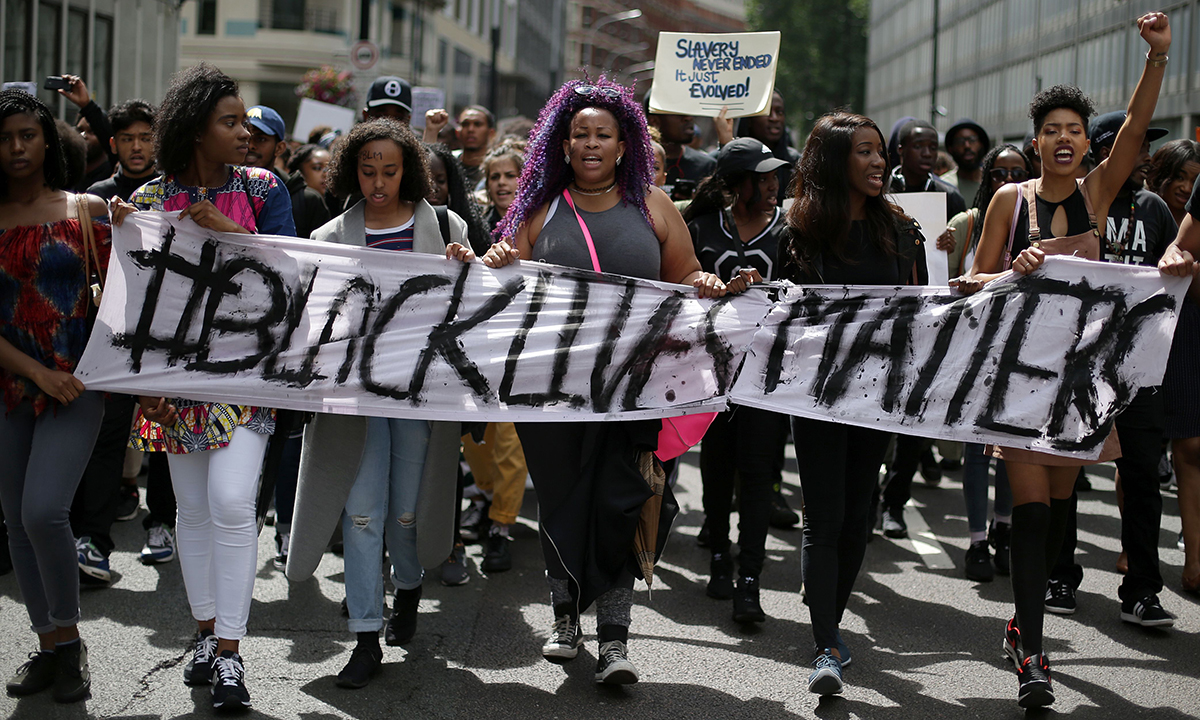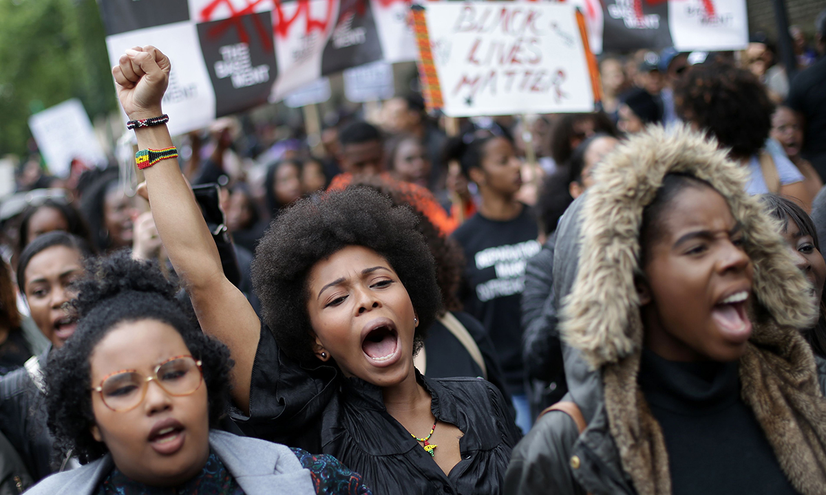 10 luglio 2016. Attraversando il centro di Londra, un gruppo di manifestanti del movimento “Black Lives Matter” marcia per solidarietà agli afro-americani uccisi dalla polizia negli Stati Uniti.