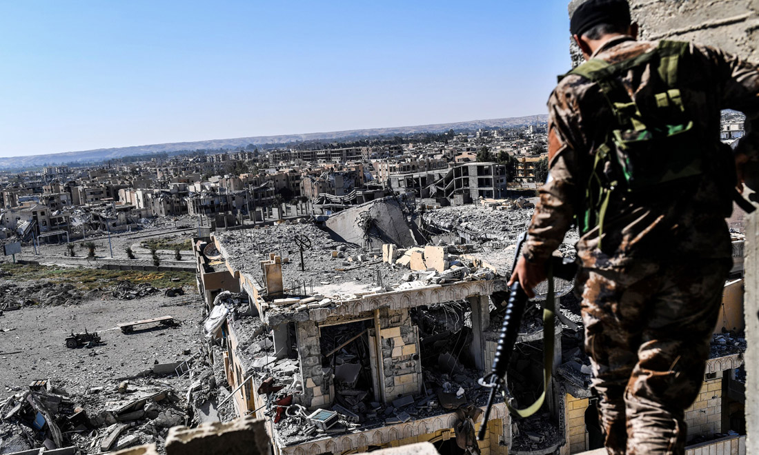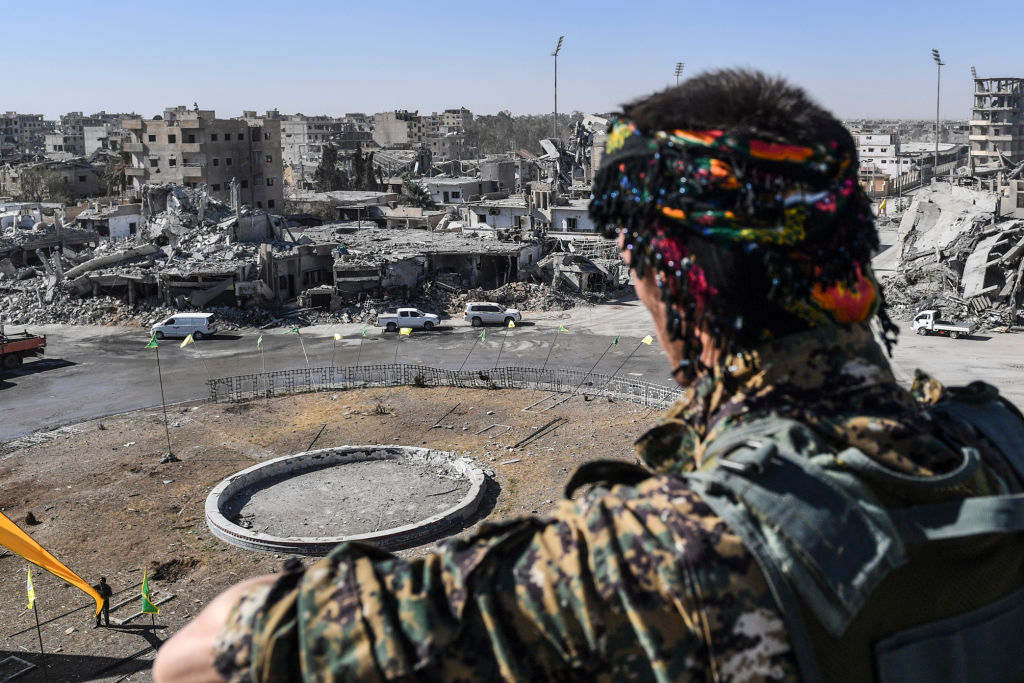 Un combattente delle forze democratiche siriane di guardia su un tetto a Raqqa, il 20 ottobre 2017, dopo aver recuperato la città liberandola dai combattenti dell’Isis.