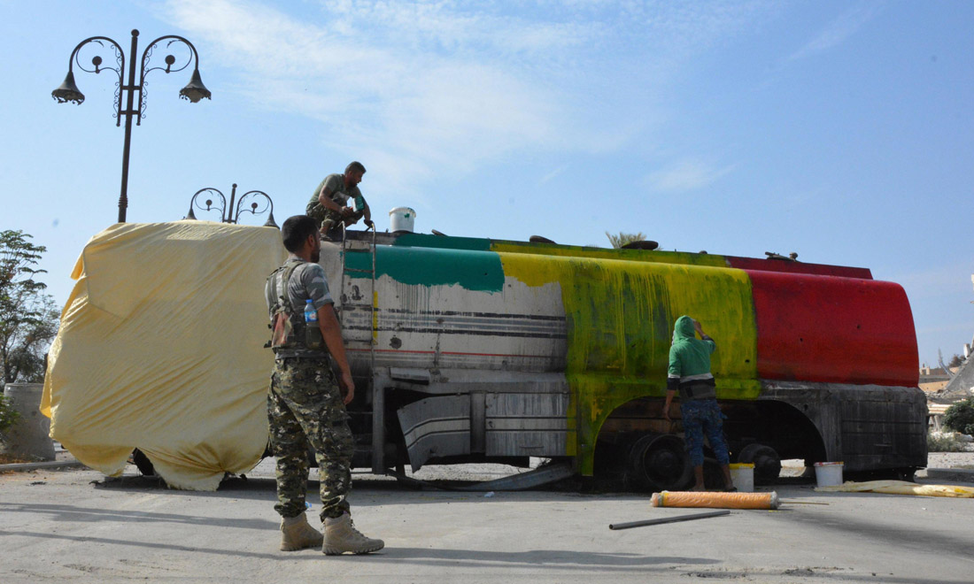 I combattenti delle forze democratiche siriane verniciano un veicolo nei colori della bandiera curda nella città di Raqqa, in Siria, il 22 ottobre 2017.