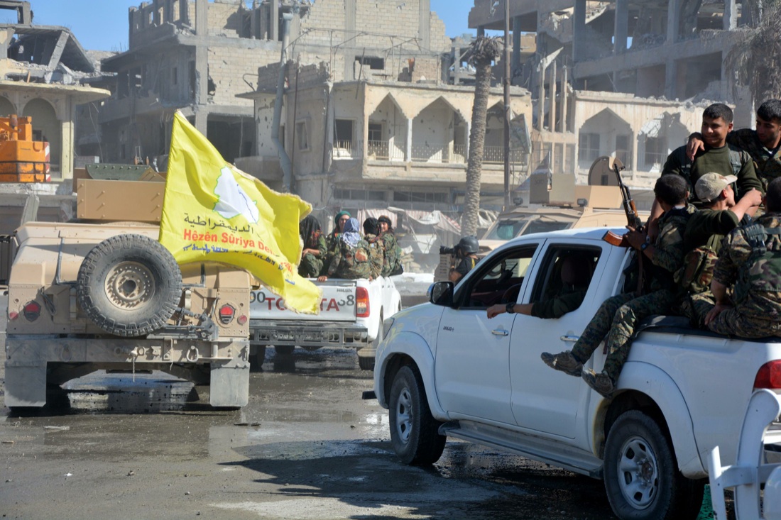 Un convoglio di combattenti delle Syrian Democratic Forces (SDF) a Raqqa, 18 ottobre 2017