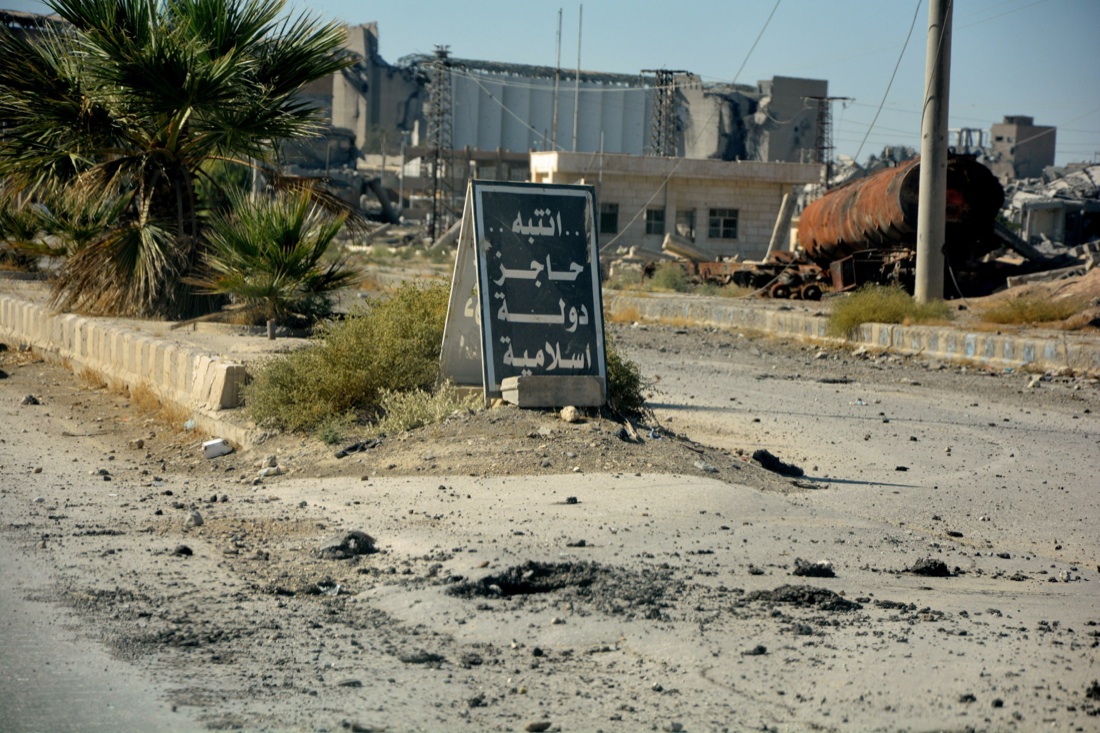 “Attenzione, posto di blocco dello Stato Islamico”, un cartello ricorda la presensa dell’Isis in Raqqa liberata, 18 ottobre 2017