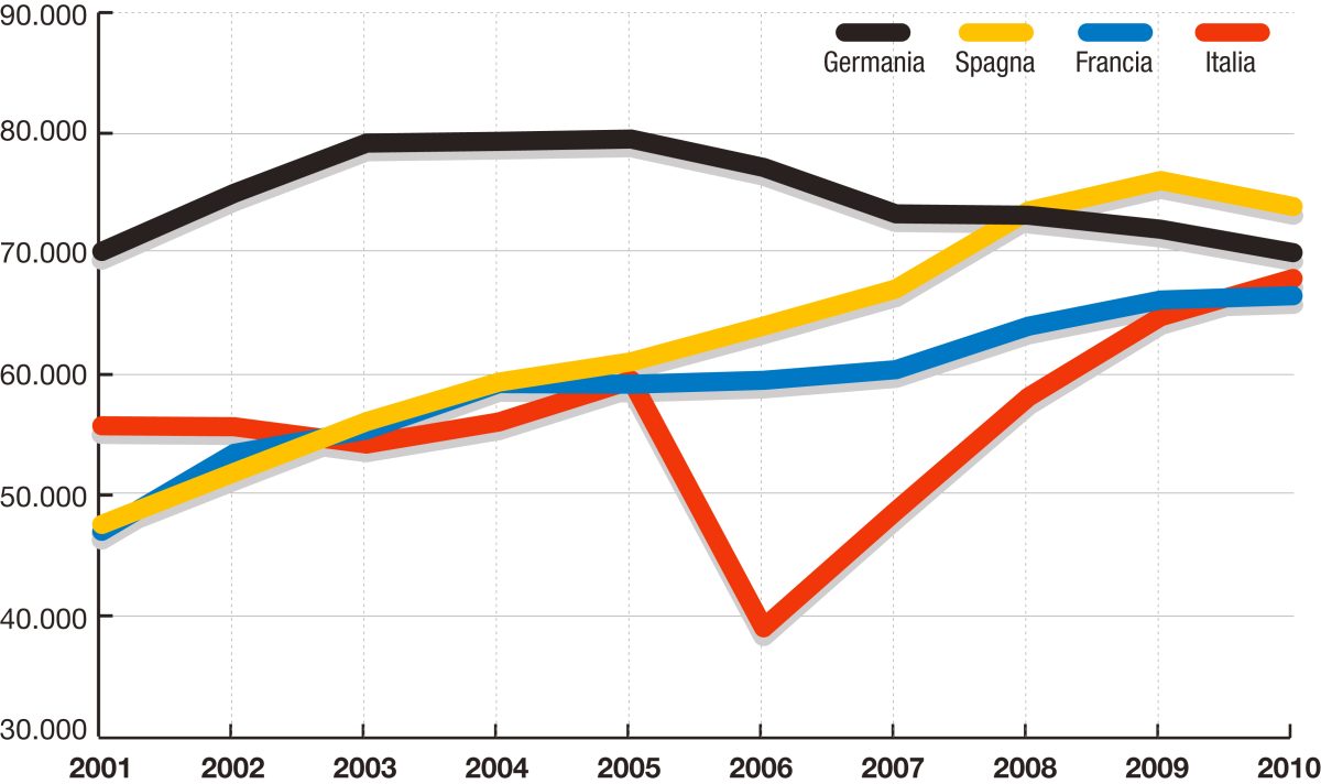 Amnistia, indulto o tutti e due. Per chi, per cosa e per quanti anni di pena? E soprattutto, perché? Alle prime domande dovrà rispondere la politica, ma sull’ultima possono rispondere i numeri. Il grafico qui sopra indica l’andamento della popolazione carceraria in alcuni dei più importanti Paesi europei tra il 2001 e il 2010 (Fonte: Eurostat). L’andamento della linea rossa mostra chiaramente il beneficio che nel 2006 ebbe sull’affollamento delle carceri l’indulto deciso dal governo Prodi nel 2006 che ridusse il numero di detenuti da 59.523 a 39.005. Ma mostra anche che appena due anni e mezzo dopo, il numero di persone detenute era tornato ad essere uguale a quello del pre-indulto: nel 2008 erano nuovamente 58.127 per passare ai 64.791 del 2009 e ai 67.961 del 2010. Per gli anni successivi, bisogna affidarsi al più aggiornato Istat secondo il quale nel 2011 i detenuti erano 66.897 e, nel 2012 65.701. Questo grafico, cioè, dimostra che senza una riforma della giustizia che depenalizzi molti reati e che riveda l’istituto della carcerazione preventiva, ogni intervento emergenziale, per quanto necessario, verrebbe vanificato dopo appena un paio di anni.