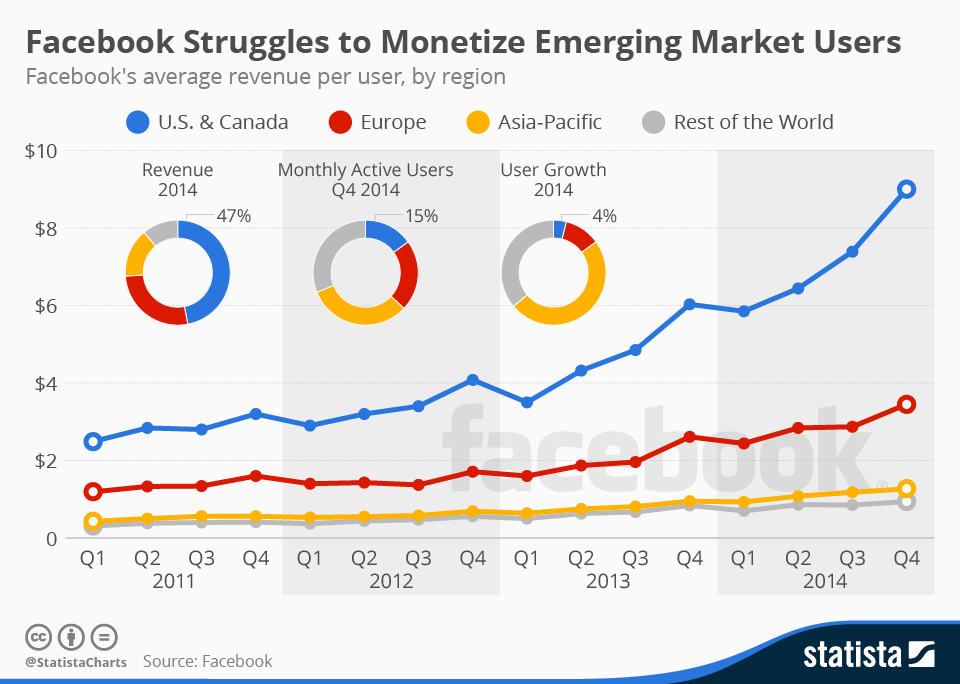 19951865Le incongruenze tra le tre regioni emergono con chiarezza da un grafico elaborato da Statista, che mostra come Facebook sia riuscito a ricavare ben 9 dollari di profitti da ogni utente americano, 3,45 da quelli europei, appena 1,27 da quelli asiatici e ancora meno nel resto del mondo. Complessivamente, quindi, il 37 per cento dei suoi fan occidentali contribuiscono per il 75 per cento al benessere della società. Se aggiungiamo che nel 2014 il numero di utenti è cresciuto circa del 4 per cento in America, del 12 in Europa, del 50 in Asia e del 34 nel resto del mondo, è evidente che se Zuckerberg vuole consolidare l’andamento positivo attuale ha bisogno di mettere a punto nuove strategie per guadagnare di più dal traffico generato in Oriente e nelle altre regioni emergenti.