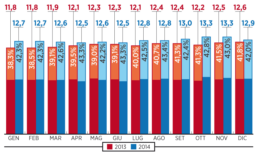 Nel grafico il confronto tra i dati sulla disoccupazione mensile tra il 2013 e il 2014. I dati all’interno di ogni singola colonna rappresenta il dato sul tasso della disoccupazione giovanile, quelli all’esterno quelli sulla disoccupazione totale.