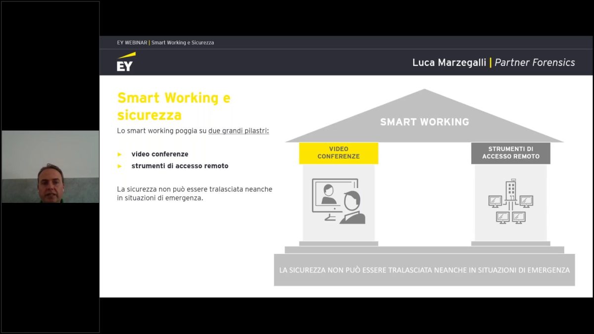 Luca Marzegalli, Partner della divisione Forensics di EY, ci illustra quali rischi e benefici lo smart working può creare per un’azienda. L’appoggiarsi a sistemi informatici a distanza è ora necessario per molte professionalità e può creare opportunità, ma rende necessaria una gestione corretta e coerente alle esigenze.
